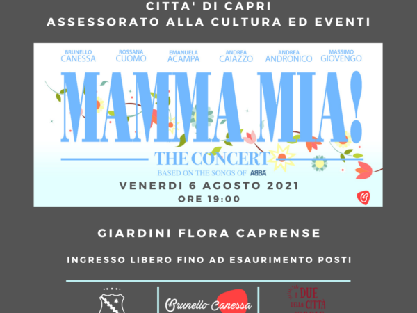 Mamma mia è il titolo del concerto che si terrà venerdì 6 agosto 2021 alle 19 nei Giardini della Flora Caprense. Uno spettacolo entusiasmante e